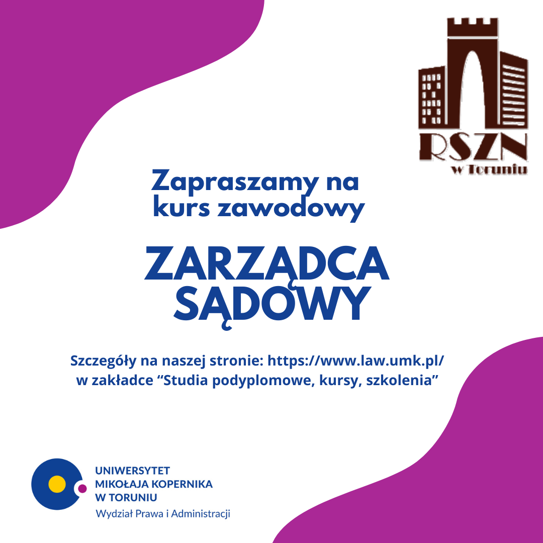 Uniwersytet Mikołaja Kopernika w Toruniu, Wydział Prawa i Administracji,  przy współpracy z Regionalnym Stowarzyszeniem Zawodów Nieruchomościowych w Toruniu zapraszają do udziału w kursie zawodowym „Zarządca sądowy”.