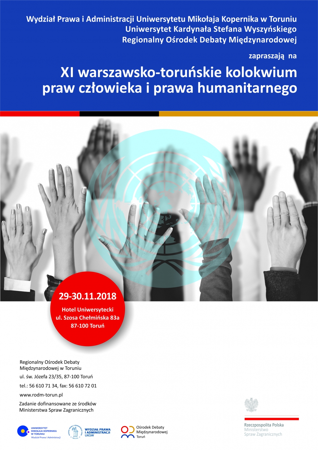 W dniach 29-30 listopada 2018 roku odbyło się w Toruniu XI warszawsko-toruńskie kolokwium praw człowieka i międzynarodowego prawa humanitarnego. Tegoroczne wydarzenie objęte było honorowym patronatem przez Ministra Spraw Zagranicznych Pana Jacka Czaputowicza.