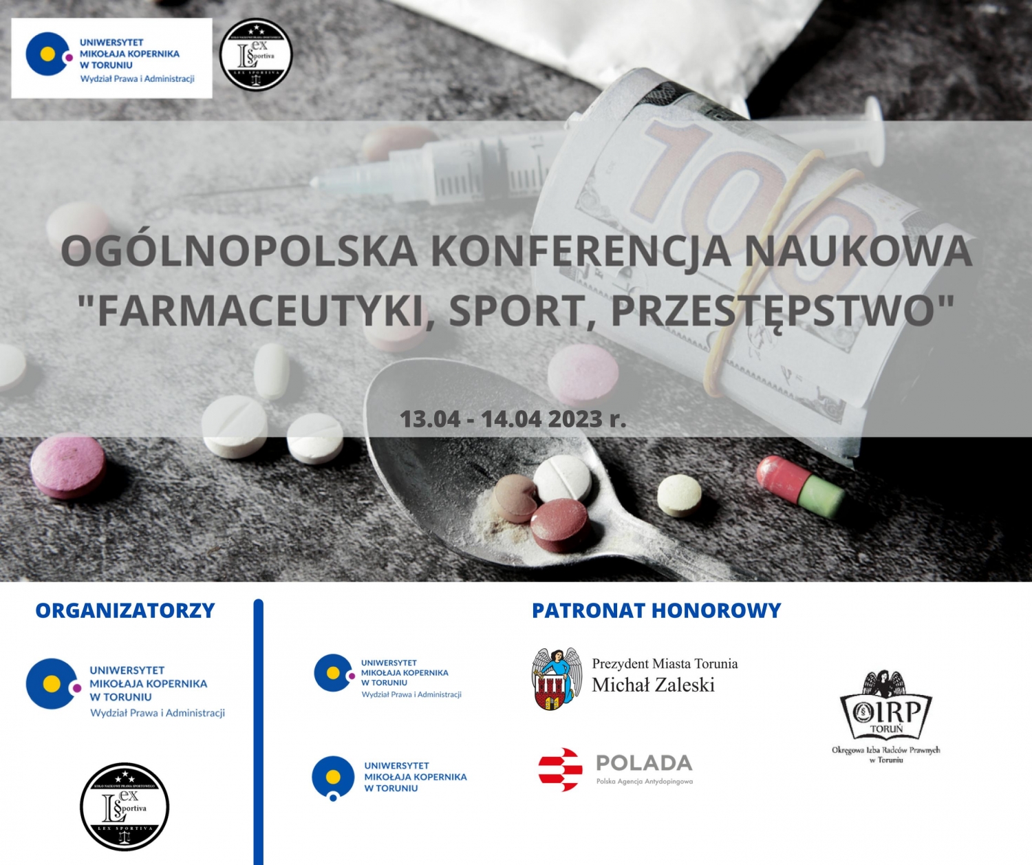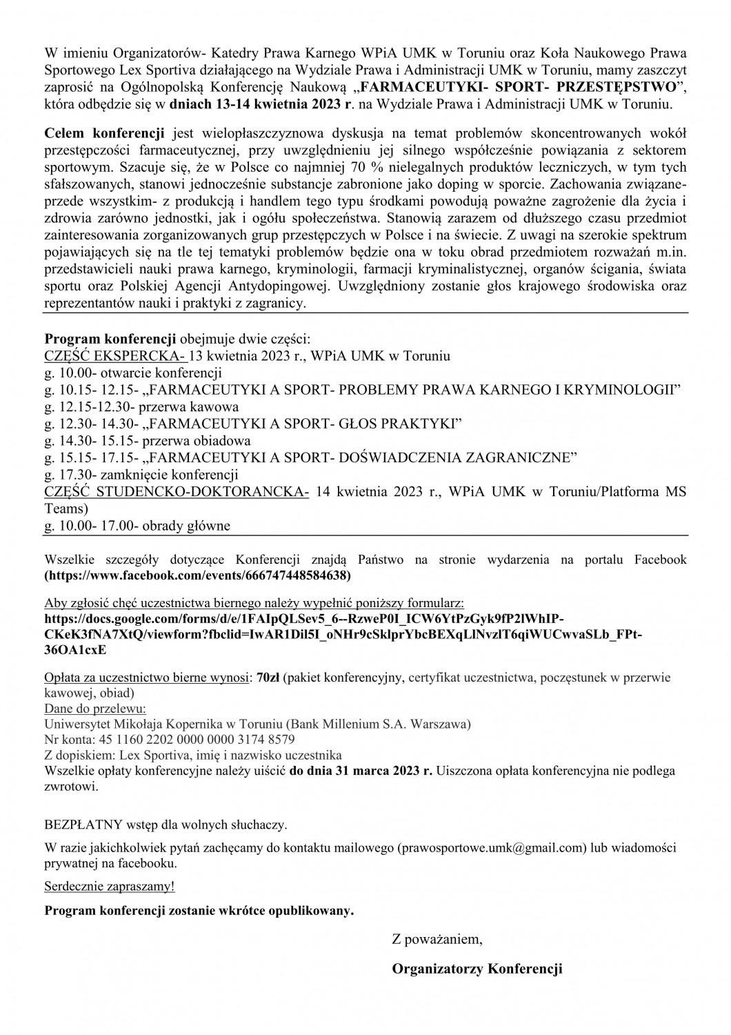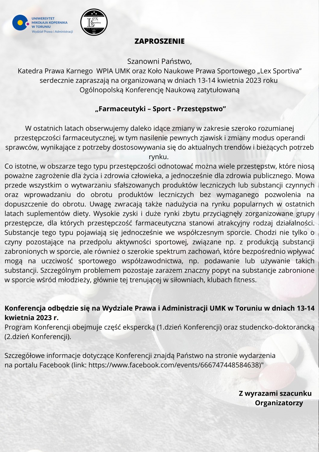 w imieniu Organizatorów- Katedry Prawa Karnego WPiA UMK w Toruniu oraz Koła Naukowego Prawa Sportowego Lex Sportiva działającego na WPiA UMK w Toruniu, we współpracy z Polską Agencją Antydopingową, mamy zaszczyt zaprosić na Ogólnopolską Konferencję Naukową „FARMACEUTYKI- SPORT- PRZESTĘPSTWO”, która odbędzie się w dniach 13-14 kwietnia 2023 r. na Wydziale Prawa i Administracji UMK w Toruniu.
