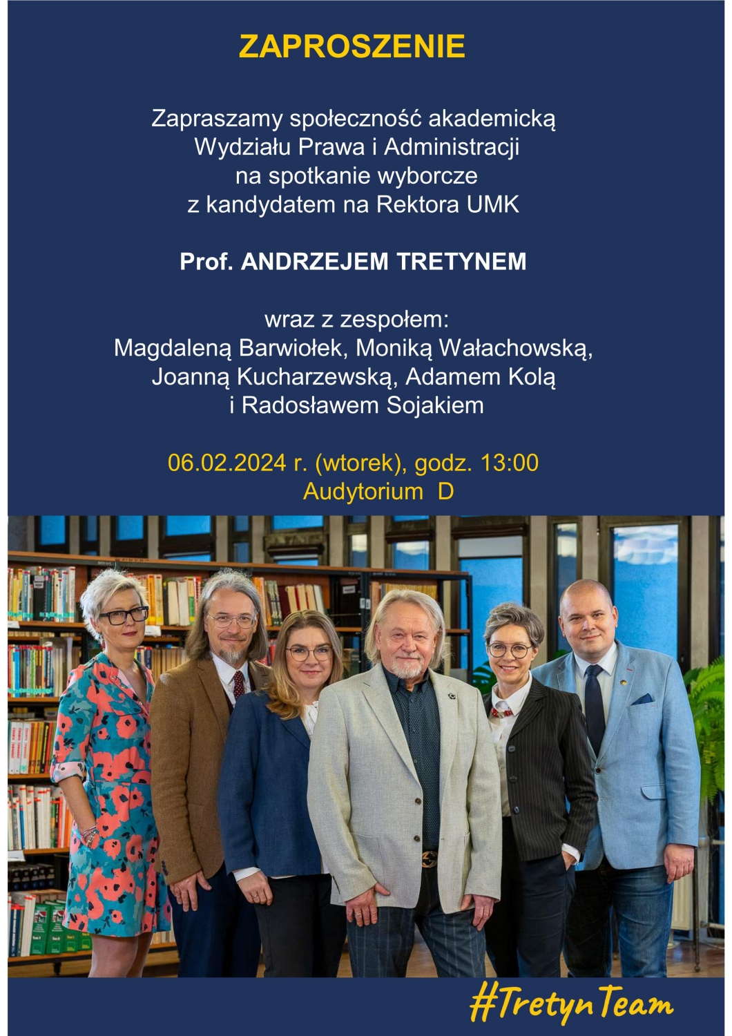 Zaproszenie Wspólnoty Wydziału Prawa i Administracji do udziału w spotkaniu z prof. Andrzejem Tretynem - kandydatem w wyborach na Rektora UMK w Toruniu na kadencję 2024-2028.