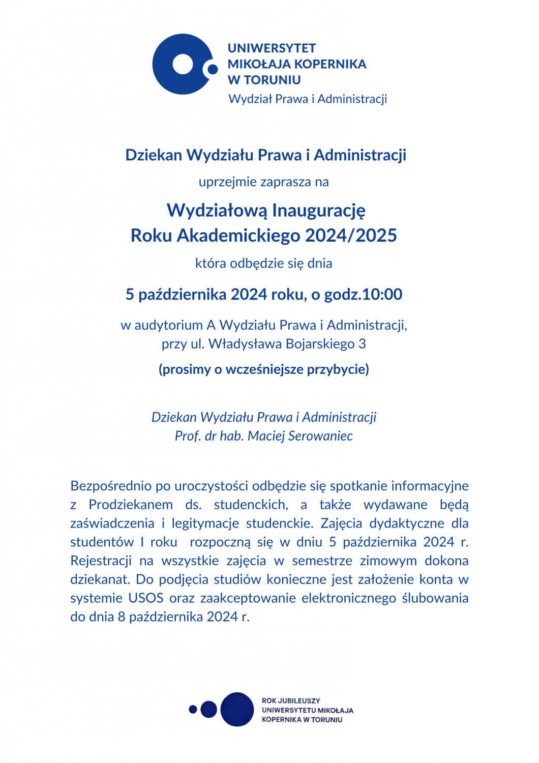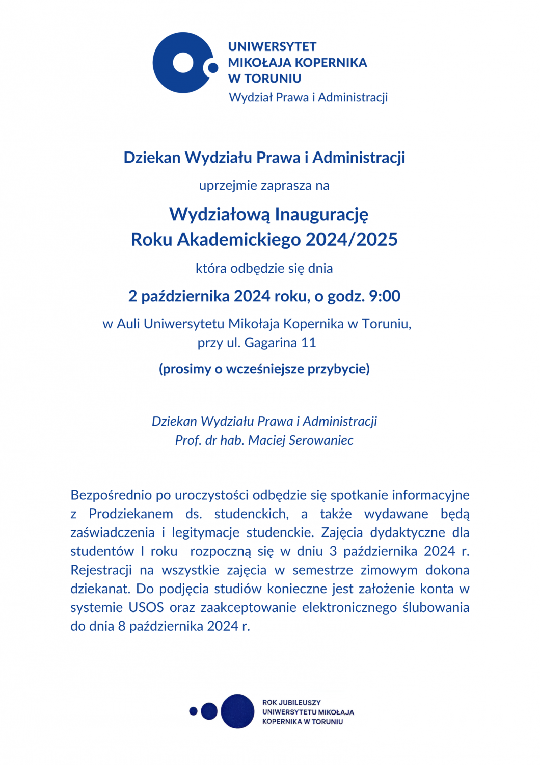 STUDIA NIESTACJONARNE - 5 października 2024 r. (sobota) o godz. 10.00 w audytorium A budynku Wydziału Prawa i Administracji UMK przy ul. Bojarskiego 3 w Toruniu.