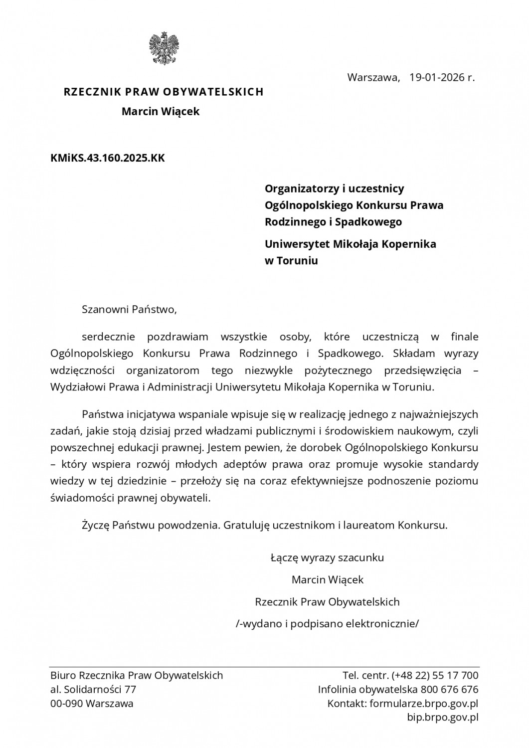 List Marcina Wiącka, Rzecznika Praw Obywatelskich, do osób, które uczestniczą w finale Ogólnopolskiego Konkursu Prawa Rodzinnego i Spadkowego.