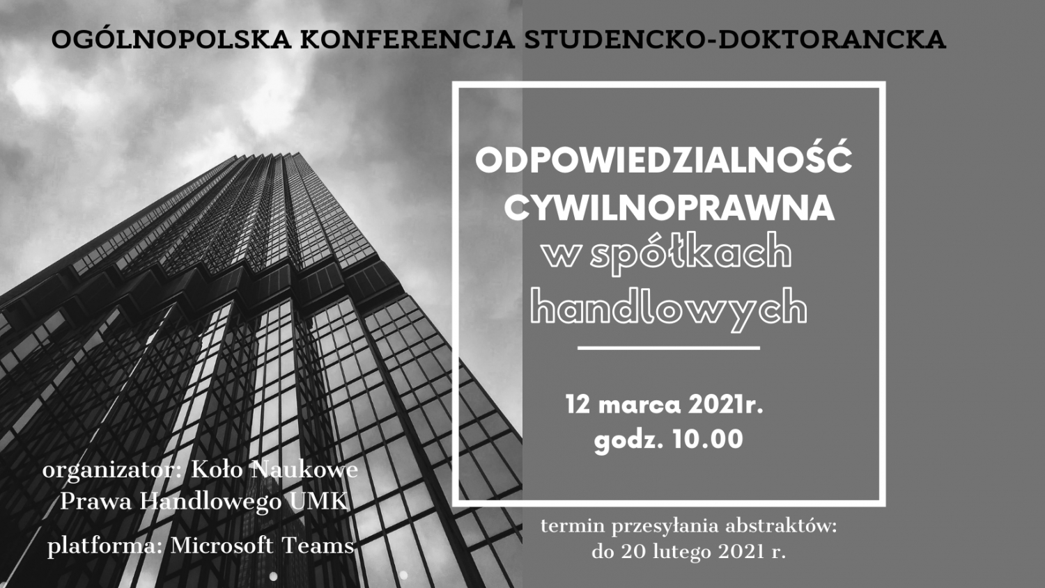 Koło Naukowe Prawa Handlowego UMK zaprasza do udziału w charakterze uczestnika biernego w Ogólnopolskiej Konferencji Studencko-Doktoranckiej pn. "Odpowiedzialność cywilnoprawna w spółkach handlowych", która rozpocznie się dnia 12 marca 2021r. (piątek) o godz. 10.00 na platformie Microsoft Teams. Z agendą Konferencji można zapoznać się poniżej.