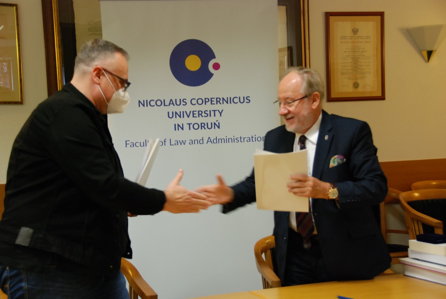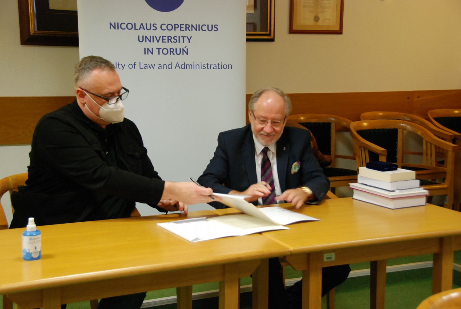 Podczas spotkania nastąpiło uroczyste podpisanie porozumienia o współpracy pomiędzy Wydziałem Prawa i Administracji UMK a V Liceum Ogólnokształcącym im. Jana Pawła II w Toruniu. Podpisy pod porozumieniem złożyli: Dziekan Wydziału Prawa i Administracji Prof. dr hab. Zbigniew Witkowski i dyrektor V LO mgr Marcin Olszewski. Niebawem rozpoczną się prace nad przygotowaniem porozumień z kolejnymi liceami.