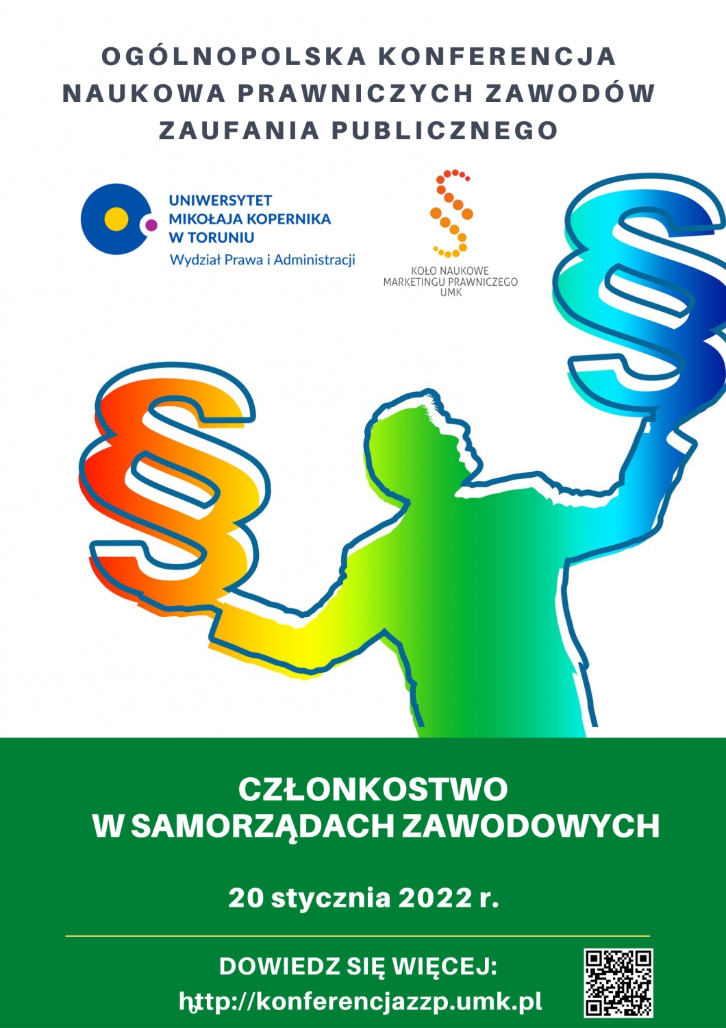 Katedra Prawa Administracyjnego oraz Koło Naukowe Marketingu Prawniczego UMK serdecznie zaprasza na organizowaną w formie zdalnej (MS Teams) w dniu 20 stycznia 2022 r. w Toruniu, III edycję Ogólnopolskiej Konferencji Naukowej Prawniczych Zawodów Zaufania Publicznego. Kolejną edycję konferencji postanowiliśmy poświęcić zagadnieniu "Członkostwa w samorządach zawodowych".