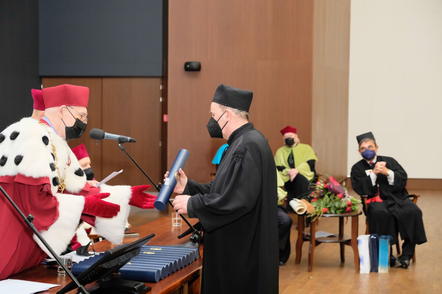 Szczególny punkt programu Święta stanowiło nadanie godności doktora honoris causa prof. Martinowi Kramerowi z Wydziału Medycyny Weterynaryjnej Uniwersytetu Justusa Liebiga w Giessen. Najwyższe wyróżnienie akademickie Uniwersytet Mikołaja Kopernika w Toruniu przyznał prof. Martinowi Kramerowi w dowód uznania dla jego wkładu w rozwój nowoczesnych technik obrazowania i europejskiej edukacji weterynaryjnej oraz za krzewienie wiedzy i umiejętności praktycznych. Sylwetkę prof. Kramera przedstawił dziekan Wydziału Nauk Biologicznych i Weterynaryjnych prof. dr hab. Werner Ulrich, a laudatio wygłosił promotor doktoratu prof. dr hab. Jędrzej Maria Jaśkowski, dyrektor Instytutu Medycyny Weterynaryjnej UMK.