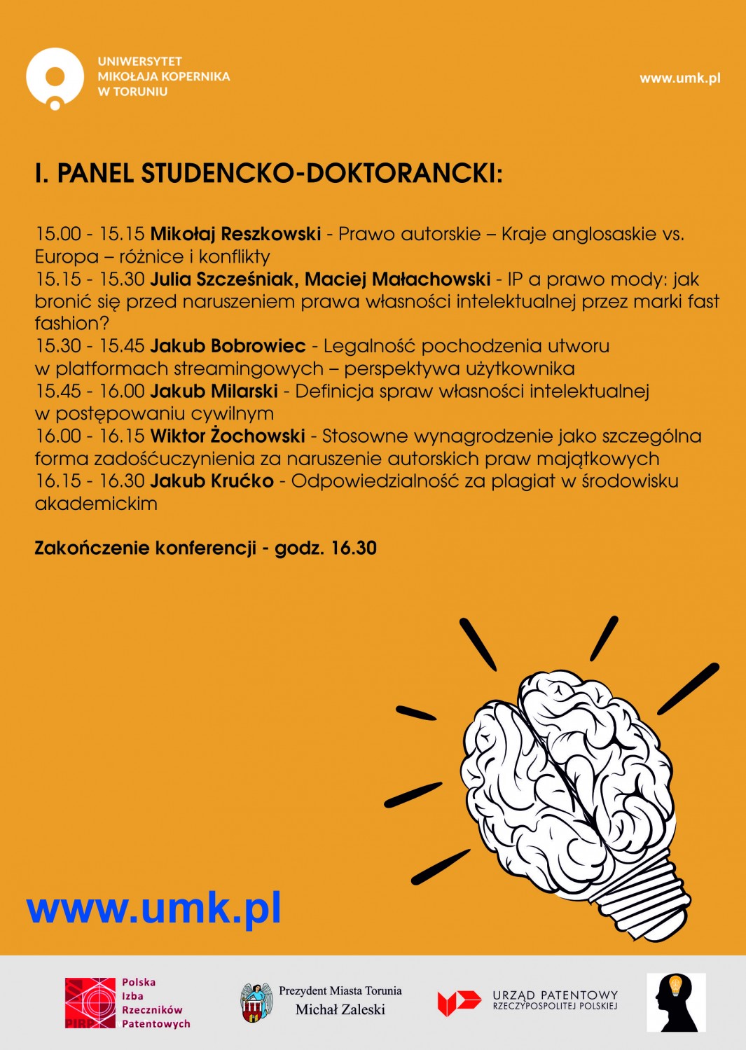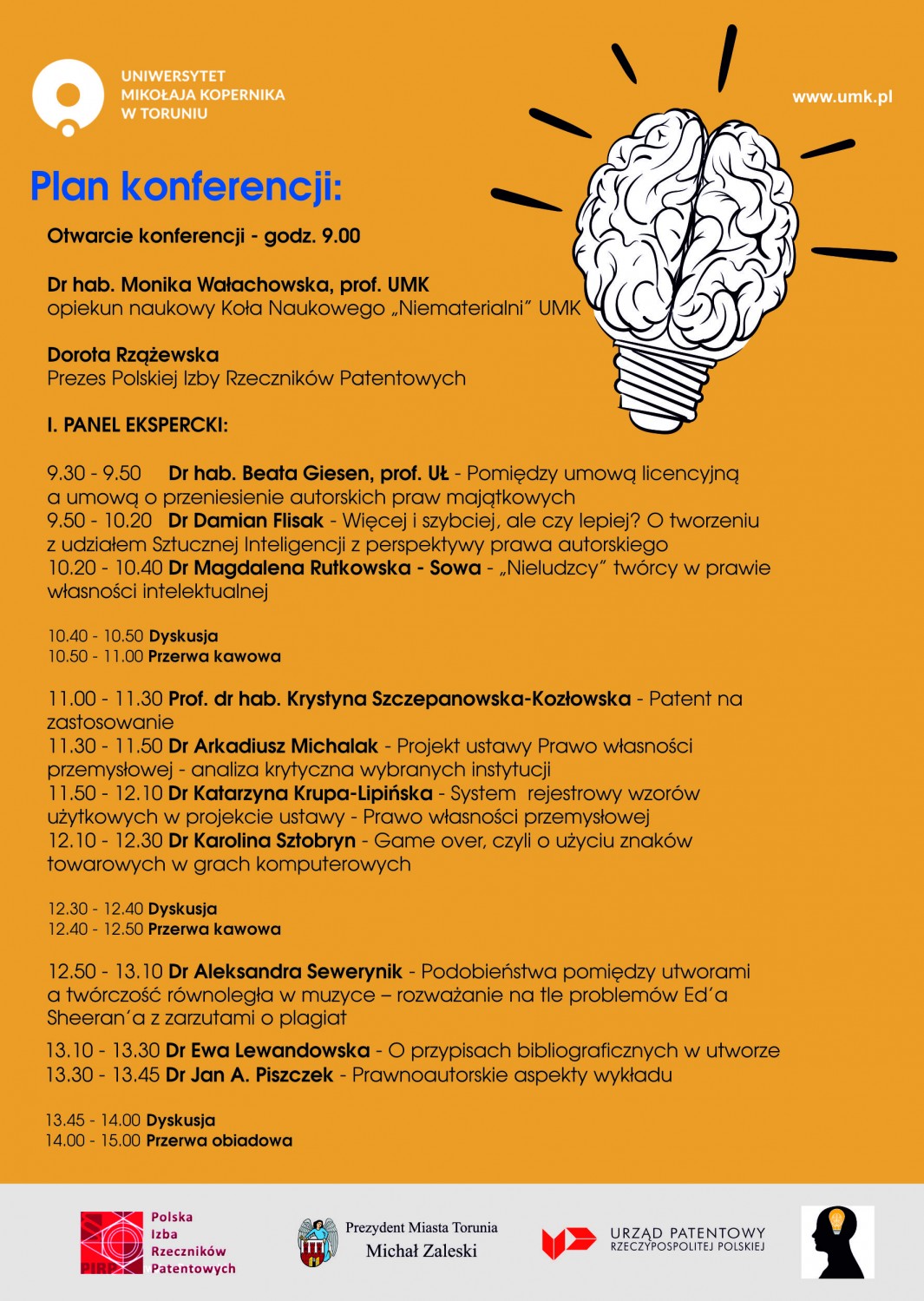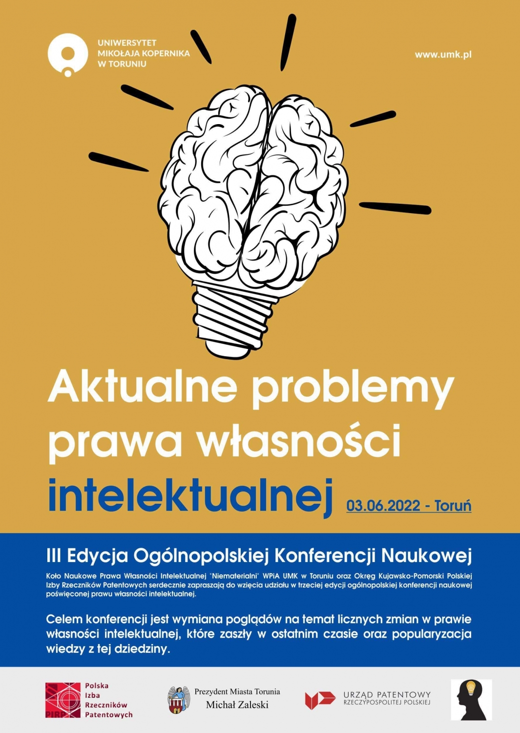 Koło Naukowe Prawa Własności Intelektualnej "Niematerialni" WPiA UMK w Toruniu oraz Okręg Kujawsko-Pomorskiej Izby Rzeczników Patentowych zapraszają do wzięcia udziału w trzeciej edycji ogólnopolskiej konferencji naukowej pt. "Aktualne problemy prawa własności intelektualnej".
