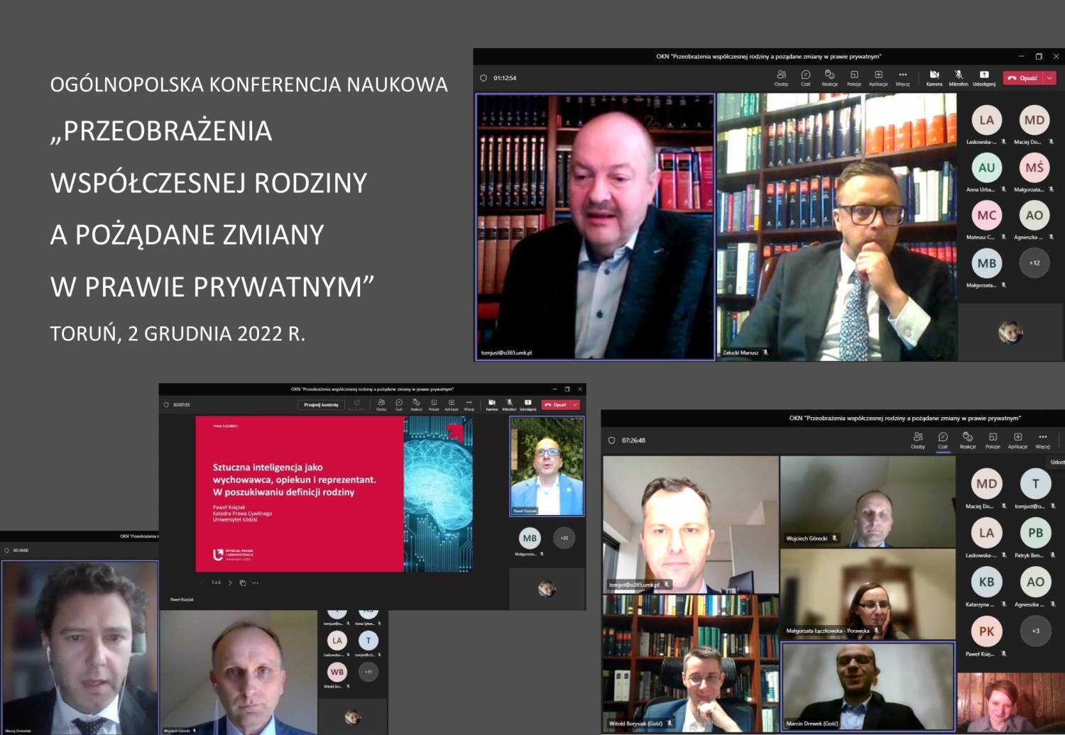 W dniu 2 grudnia 2022 r. odbyła się kolejna edycja ogólnopolskiej konferencji naukowej poświęconej współczesnym tendencjom rozwojowym w prawie rodzinnym i spadkowym zorganizowana przez Katedrę Prawa Cywilnego UMK w Toruniu. Wydarzenie przygotowane zostało przez Komitet Organizacyjny w składzie: Prof. UMK dr hab. Tomasz Justyński LL.M., dr Ewa Kabza, dr Marcin Drewek oraz dr Tomasz Jasiakiewicz. Tegoroczna edycja – ciągle jeszcze, z uwagi na warunki pandemiczne albo można mieć ostrożną nadzieję post-pandemiczne – odbyła się w formie zdalnej (na platformie MsTeams).