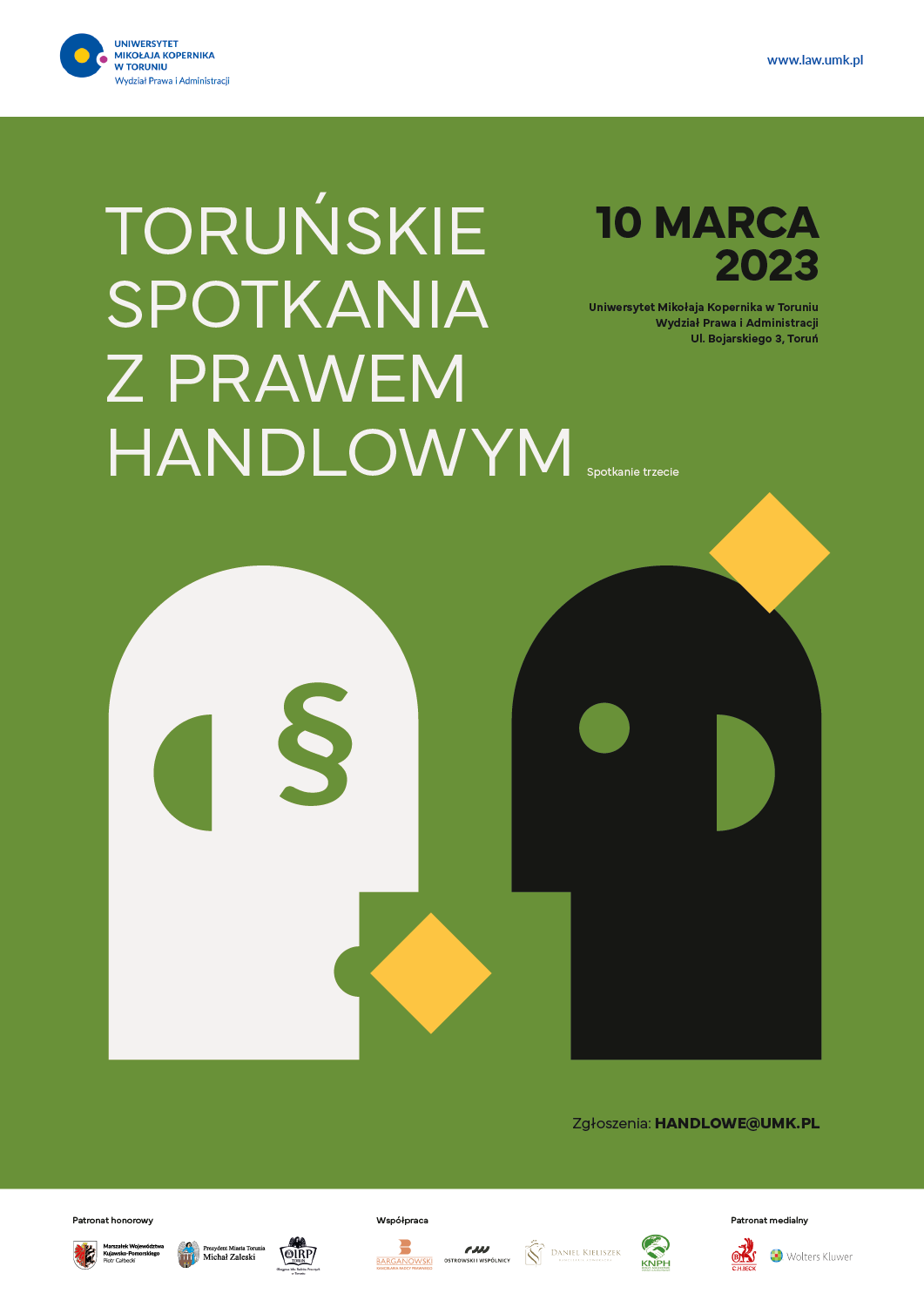 Katedra Prawa Handlowego, Morskiego i Postępowania Cywilnego oraz Koło Naukowe Prawa Handlowego serdecznie zapraszają do udziału w kolejnej edycji ogólnopolskiej konferencji naukowej pod nazwą "Toruńskie Spotkania z Prawem Handlowym".