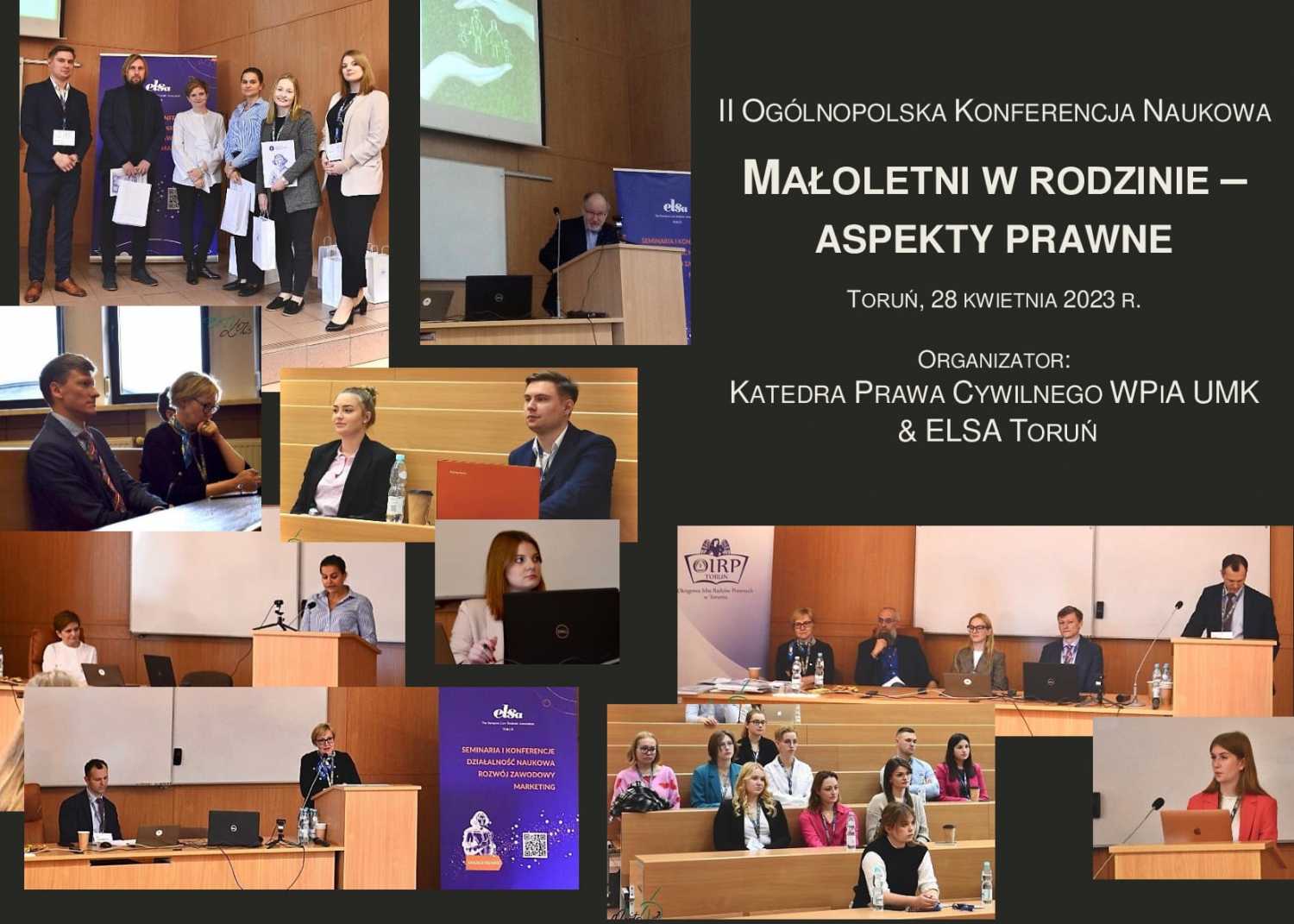 W dniu 28 kwietnia 2023 r. odbyła się II edycja ogólnopolskiej konferencji naukowej „Małoletni w rodzinie – aspekty prawne” zorganizowana przez Katedrę Prawa Cywilnego WPiA UMK w Toruniu kierowaną przez Prof. Tomasza Justyńskiego oraz ELSA Toruń i jej przewodniczącego Filipa Wiśniewskiego. Podobnie jak w ubiegłym roku potwierdziła się zarówno słuszność wyboru tematu wiodącego, jak i potrzeba kontynuowania debaty w kolejnych edycjach.