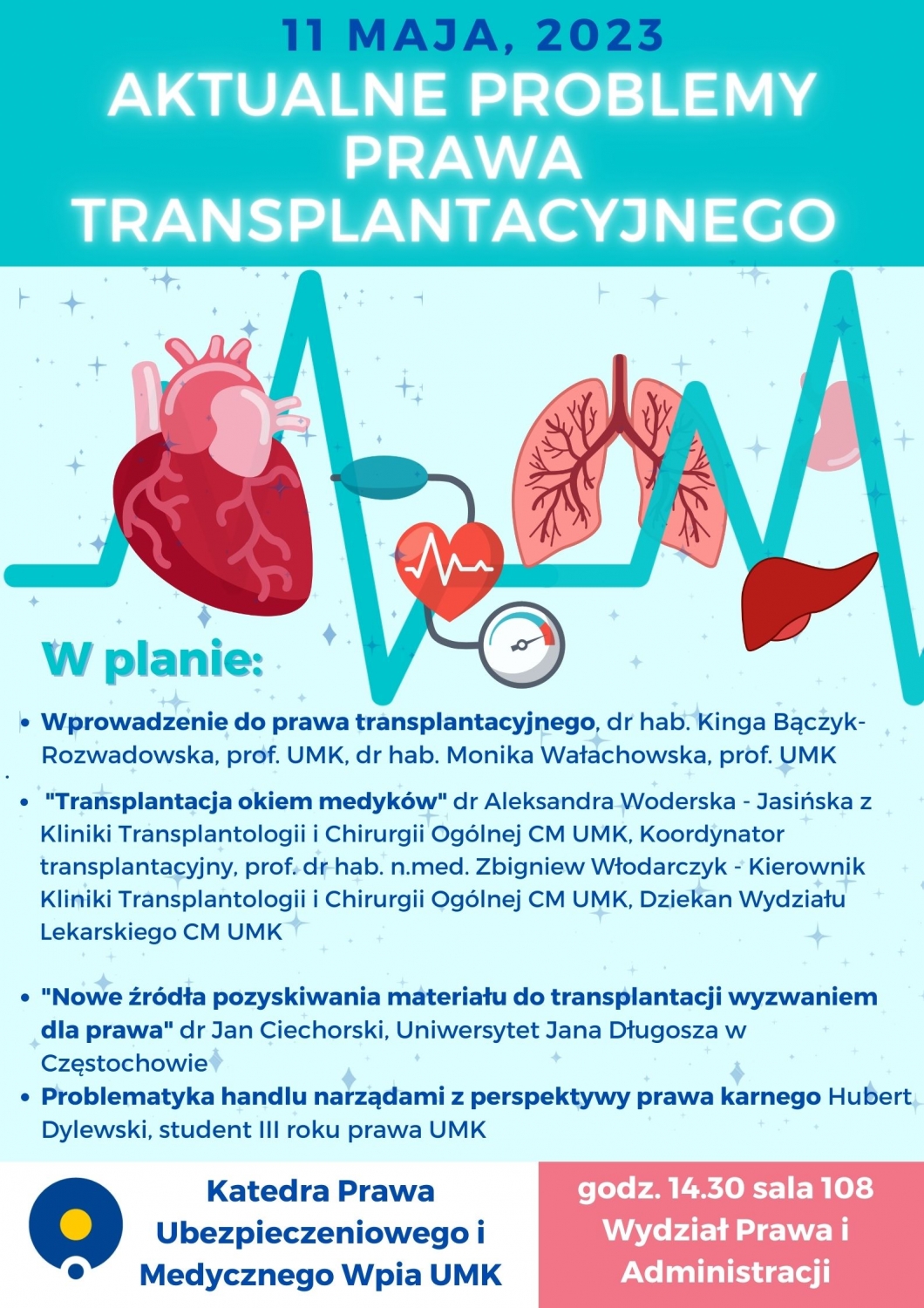 Katedra Prawa Ubezpieczeniowego i Medycznego serdecznie zaprasza na interdyscyplinarne seminarium naukowe pt. „Aktualne problemy prawa transplantacyjnego”, które odbędzie się w dniu 11 maja na Wydziale Prawa i Administracji (sala 108, początek godz. 14.30).