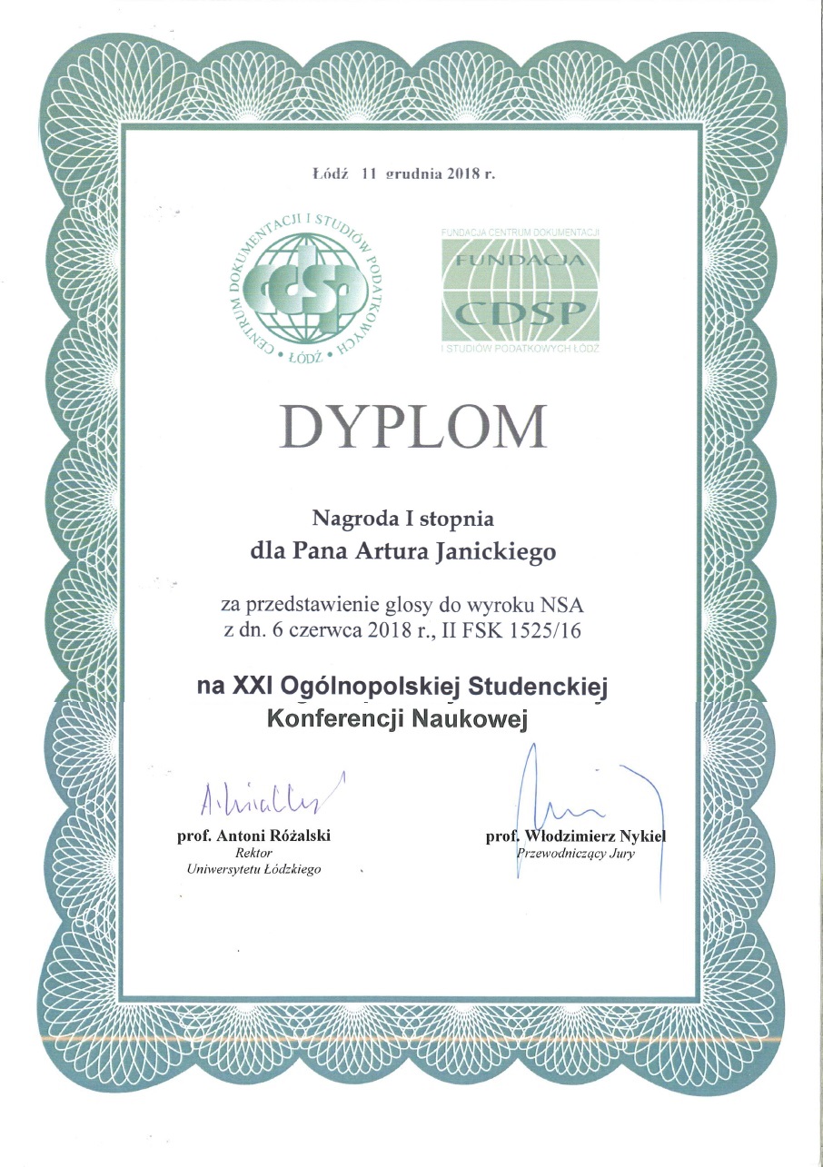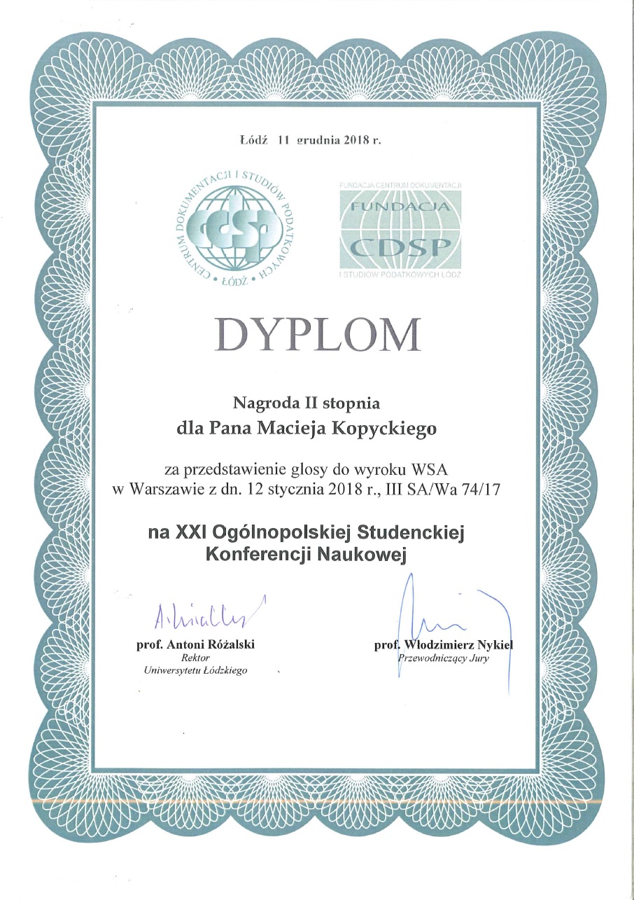 Dnia 11 grudnia 2018 r. odbyła się XXI Ogólnopolska Konferencja Naukowa dla studentów pt. "Współczesne problemy orzecznictwa sądowego w sprawach podatkowych", którą organizuje Centrum Dokumentacji i Studiów Podatkowych Uniwersytetu Łódzkiego. Studenci przygotowali i zaprezentowali przed jury glosy dotyczące najnowszych wyroków z zakresu prawa podatkowego.
