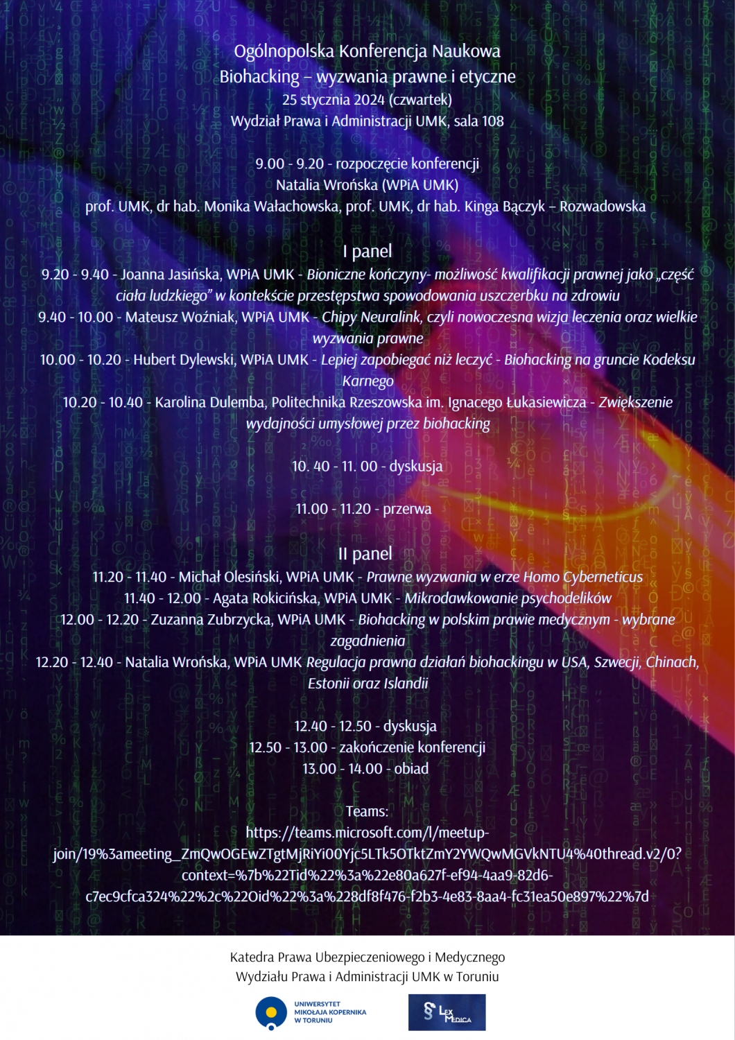 Katedra Prawa Ubezpieczeniowego i Medycznego UMK wraz z Kołem naukowych LexMedica UMK zapraszają na konferencję naukową pt. Biohacking - wyzwania prawne i etyczne, która odbędzie się na Wydziale Prawa i Administracji UMK w dn. 25 stycznia 2024 r. (sala 108 oraz MS Teams: