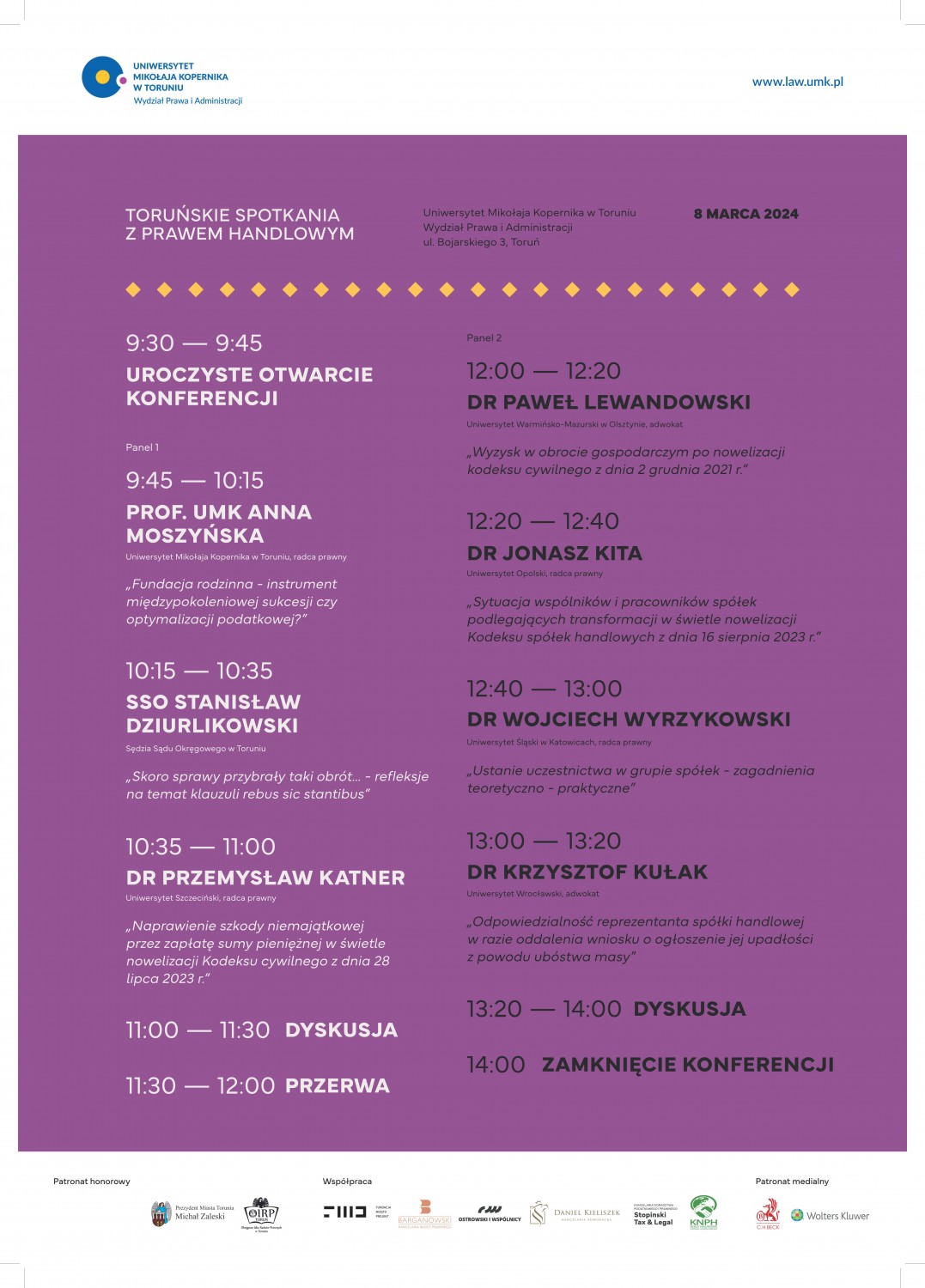Katedra Prawa Handlowego, Morskiego i Postępowania Cywilnego oraz Koło Naukowe Prawa Handlowego serdecznie zapraszają do udziału w kolejnej edycji ogólnopolskiej konferencji naukowej pt. "Toruńskie Spotkania z Prawem Handlowym".