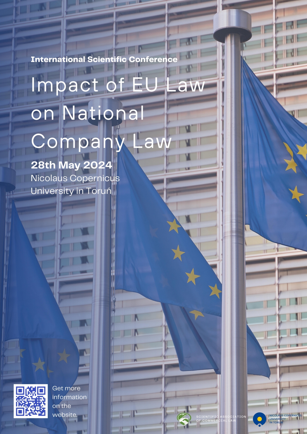 Katedra Prawa Handlowego, Morskiego i Postępowania Cywilnego wraz z Kołem Naukowym Prawa Handlowego serdecznie zapraszają pracowników naukowych oraz studentów do uczestnictwa w Międzynarodowej Konferencji Naukowej pn. "Wpływ prawa UE na krajowe prawo spółek" (ISC 'Impact of EU law on national company law'), która odbędzie się w dniu 28 maja 2024 r. na Wydziale Prawa i Administracji Mikołaja Kopernika w Toruniu (Sala Posiedzeń Rady Wydziału).