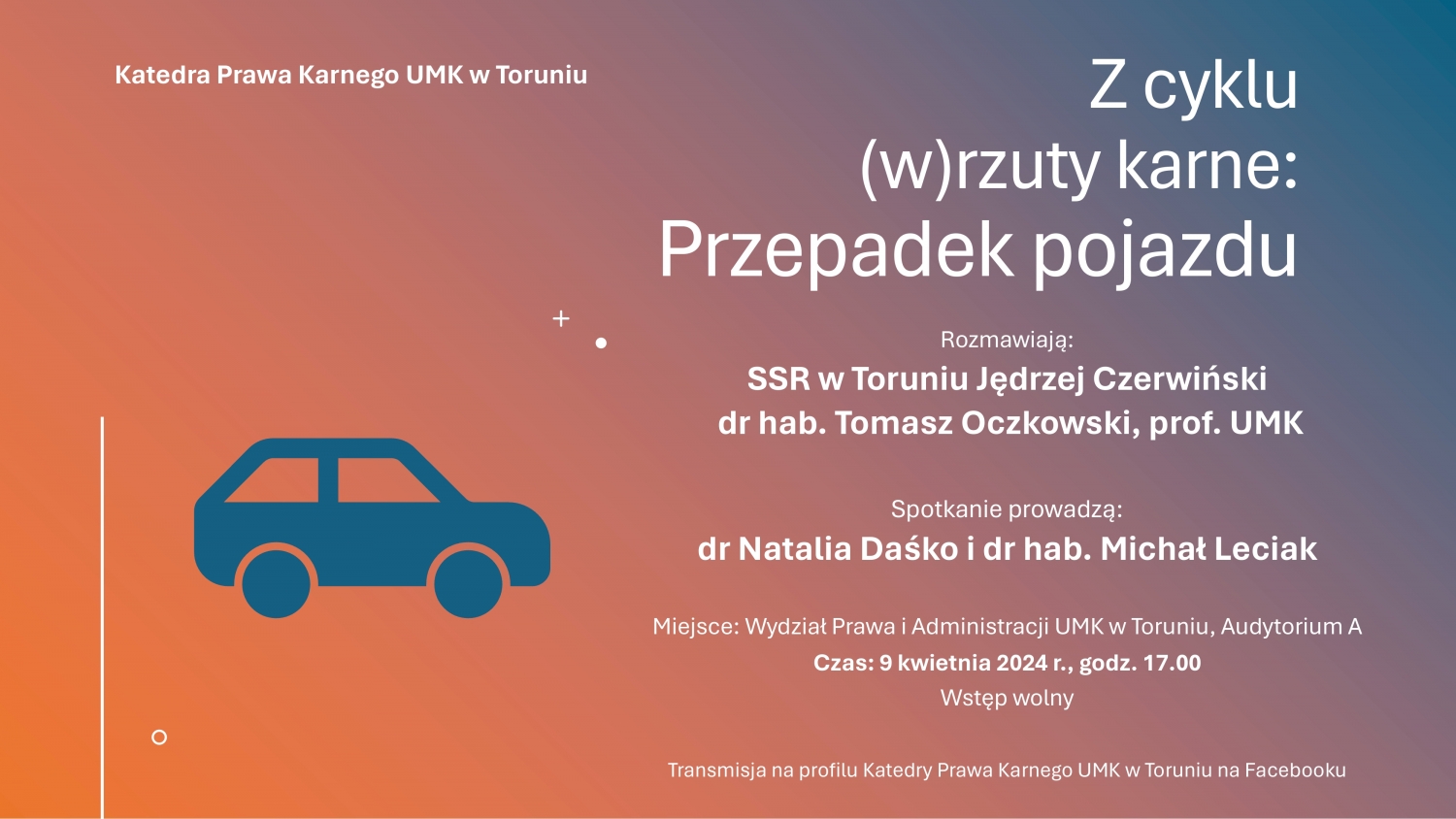Katedra Prawa Karnego UMK w Toruniu zaprasza na kolejne spotkanie z cyklu (w)rzuty karne, które poświęcone zostanie przepadkowi pojazdu.