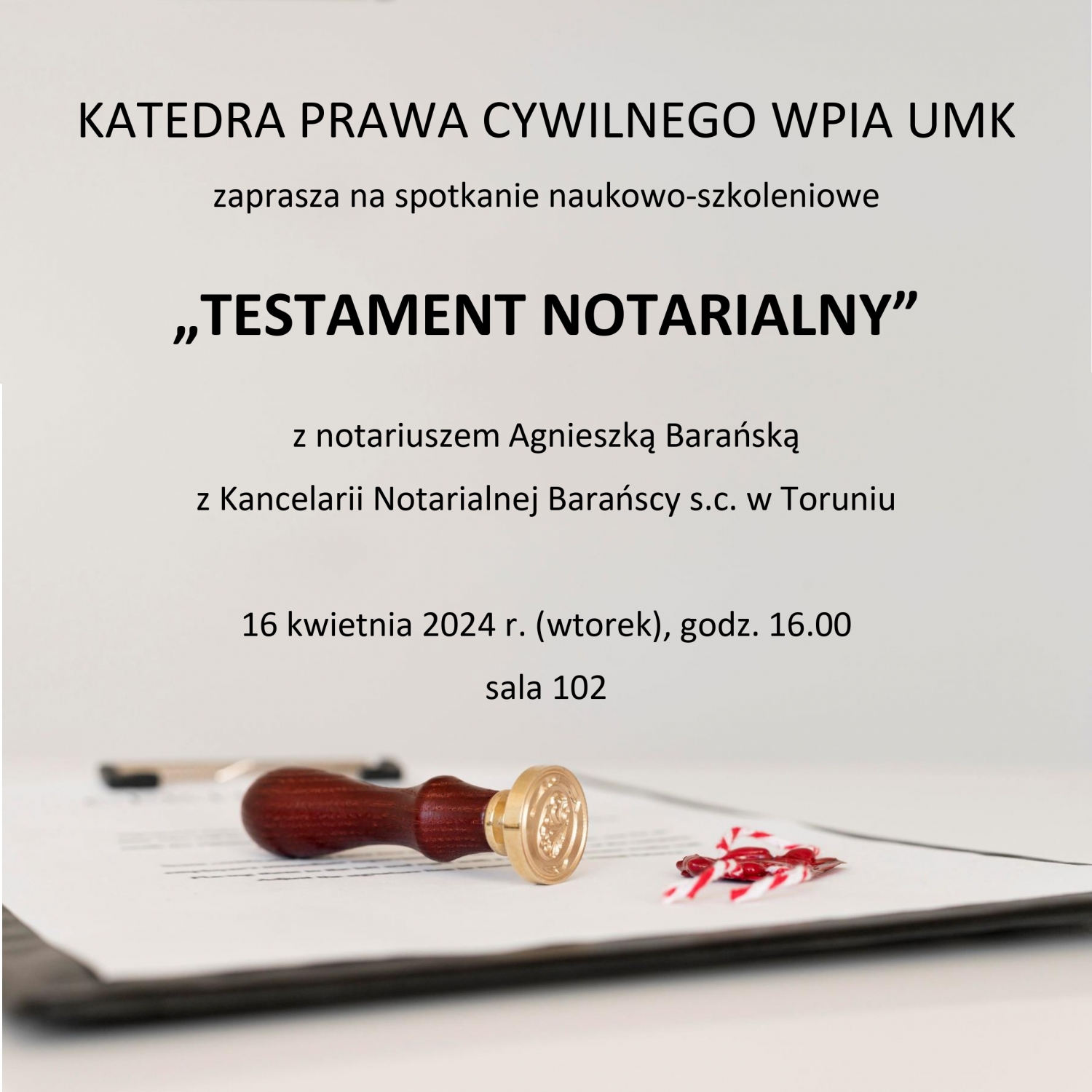 Katedra Prawa Cywilnego WPiA UMK w Toruniu serdecznie zaprasza wszystkich zainteresowanych na spotkanie naukowo-szkoleniowe pt. „Testament notarialny” z notariuszem Agnieszką Barańską z Kancelarii Notarialnej Barańscy s.c. w Toruniu.
