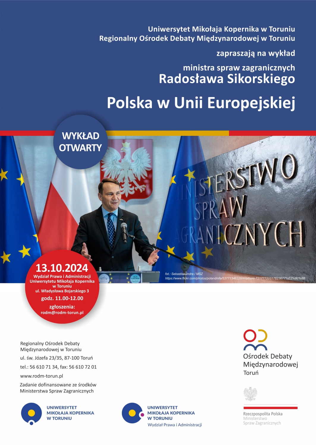 Wspólnie z Regionalnym Ośrodkiem Debaty Międzynarodowej w Toruniu oraz Uniwersytetem Mikołaja Kopernika w Toruniu zapraszamy do udziału w wykładzie Ministra Spraw Zagranicznych Radosława Sikorskiego pt. "Polska w Unii Europejskiej". Wykład odbędzie się dnia 13 października br. (niedziela), w gmachu Wydziału Prawa i Administracji, w godz. 11:00-12:00.