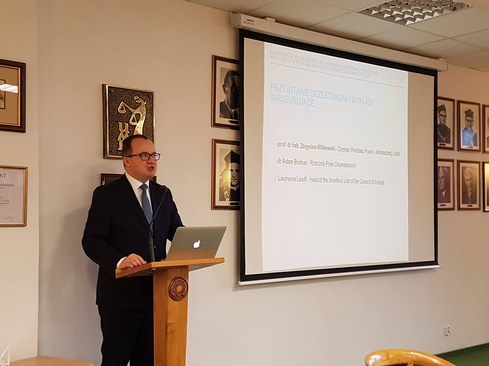 Konferencję otworzył Dziekan Wydziału Prawa i Administracji - Prof. dr hab. Zbigniew Witkowski, następnie wykłady inaugurujące zaprezentował Rzecznik Praw Obywatelskich - dr Adam Bodnar oraz Head of the Bioethics Unit of the Council of Europe - Pani Laurence Lwoff, która uczestniczyła w negocjowaniu treści Konwencji a obecnie opracowuje pod egidą Rady Europy kolejny, piąty już, protokół dodatkowy do Konwencji.