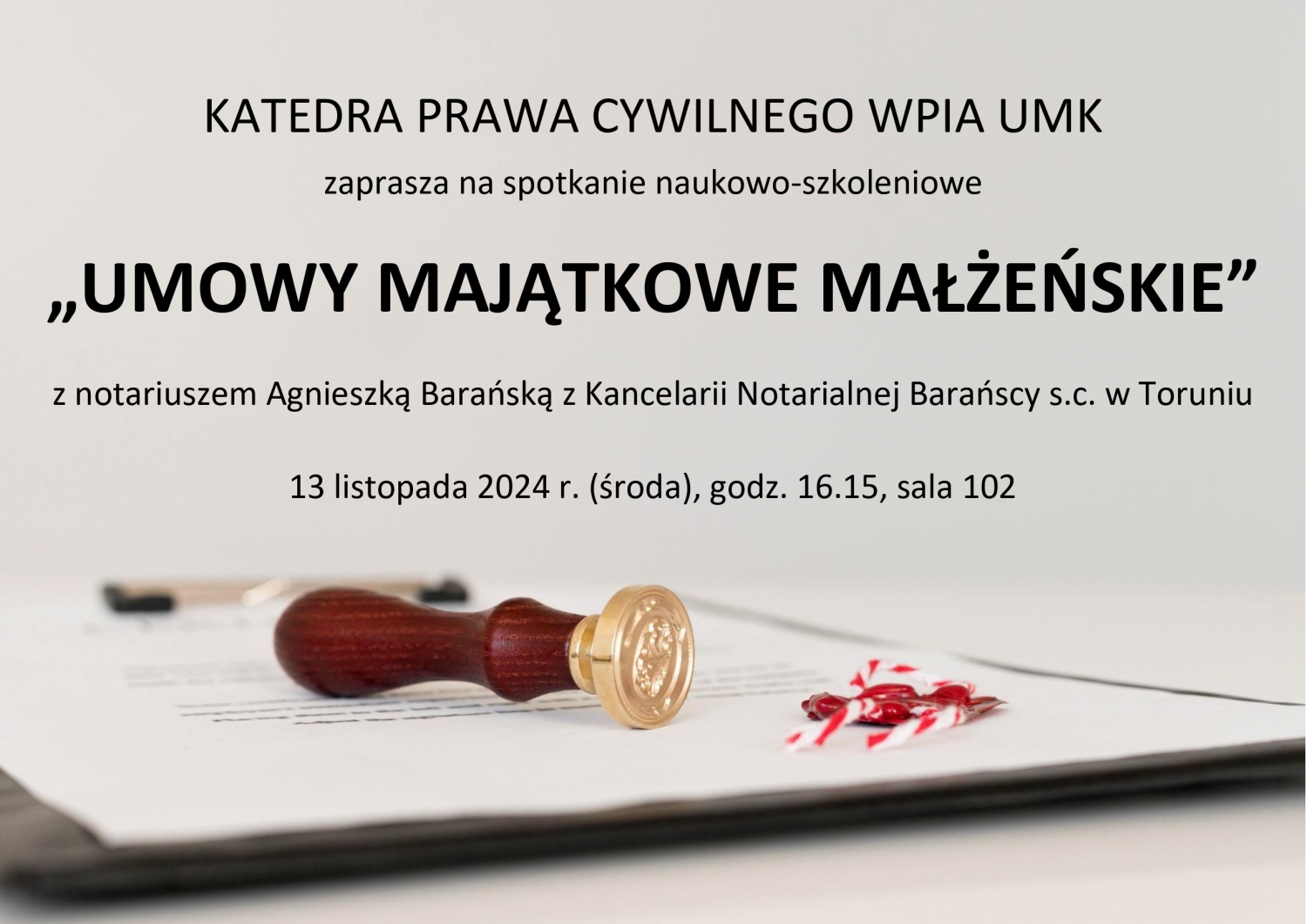 Katedra Prawa Cywilnego WPiA UMK w Toruniu serdecznie zaprasza wszystkich zainteresowanych na spotkanie naukowo-szkoleniowe pt. „Umowy majątkowe małżeńskie” z notariuszem Agnieszką Barańską z Kancelarii Notarialnej Barańscy s.c. w Toruniu.