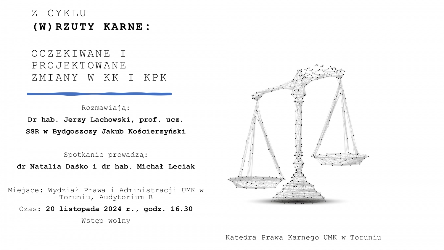 Katedra Prawa Karnego UMK w Toruniu zaprasza na kolejne spotkanie z cyklu (w)rzuty karne, które poświęcone zostanie oczekiwanym i projektowanym zmianom w KK i KPK.