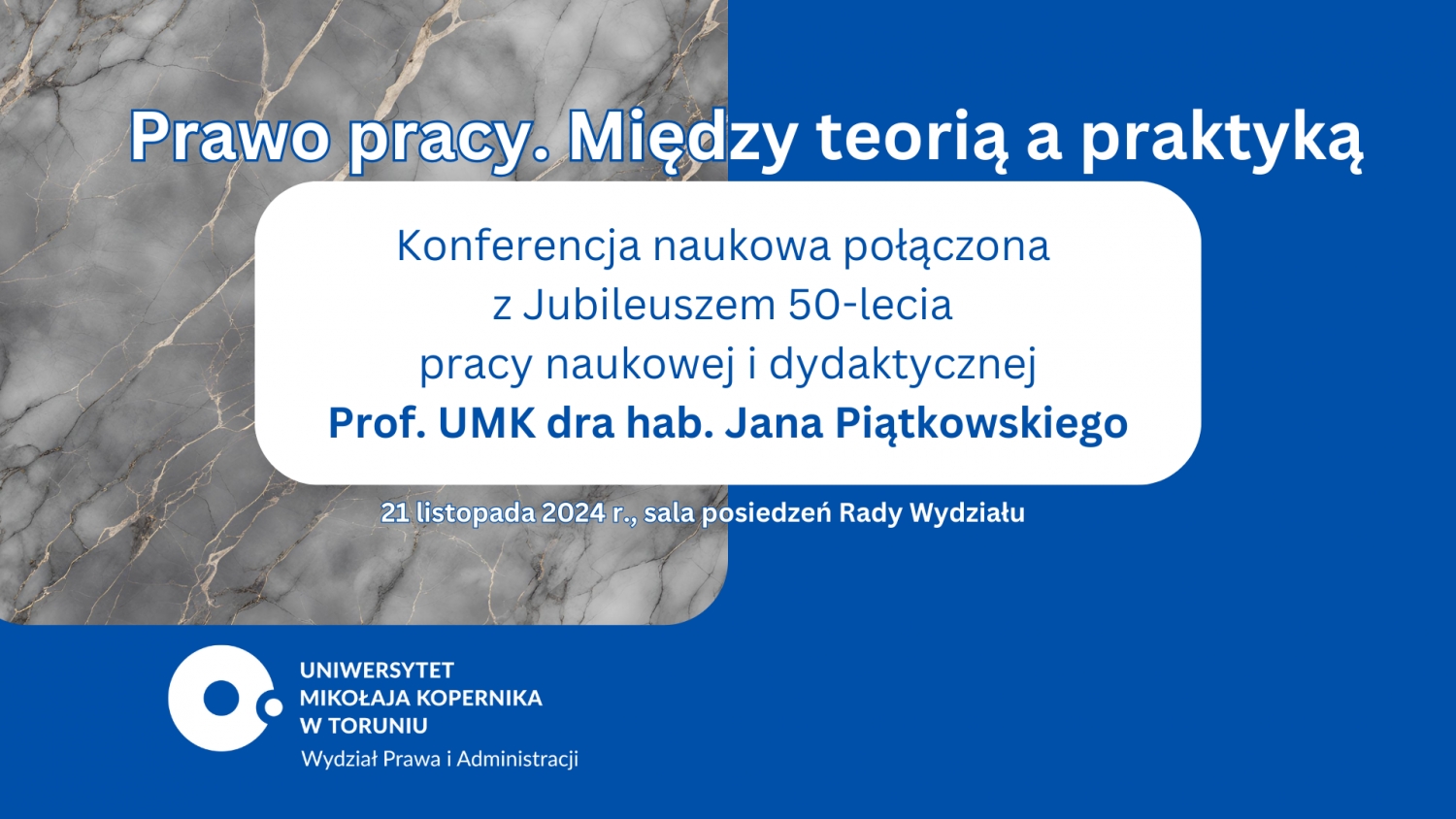 Katedra Prawa Pracy Wydziału Prawa i Administracji Uniwersytetu Mikołaja Kopernika w Toruniu ma zaszczyt zaprosić Państwa na konferencję: “Prawo pracy. Między teorią a praktyką” połączoną z Jubileuszem 50-lecia pracy naukowej i dydaktycznej Prof. UMK dra hab. Jana Piątkowskiego, która odbędzie się 21 listopada 2024 r. w Toruniu, na Wydziale Prawa i Administracji w sali posiedzenie Rady Wydziału.