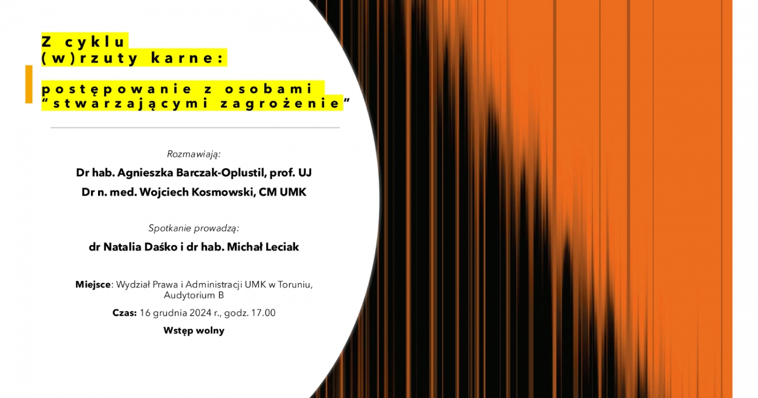 Katedra Prawa Karnego UMK w Toruniu zaprasza na ostatnie w tym semestrze spotkanie z cyklu (w)rzuty karne, które poświęcone zostanie ustawie z 22 listopada 2013 r. o postępowaniu wobec osób z zaburzeniami psychicznymi stwarzających zagrożenie życia, zdrowia lub wolności seksualnej innych osób.
