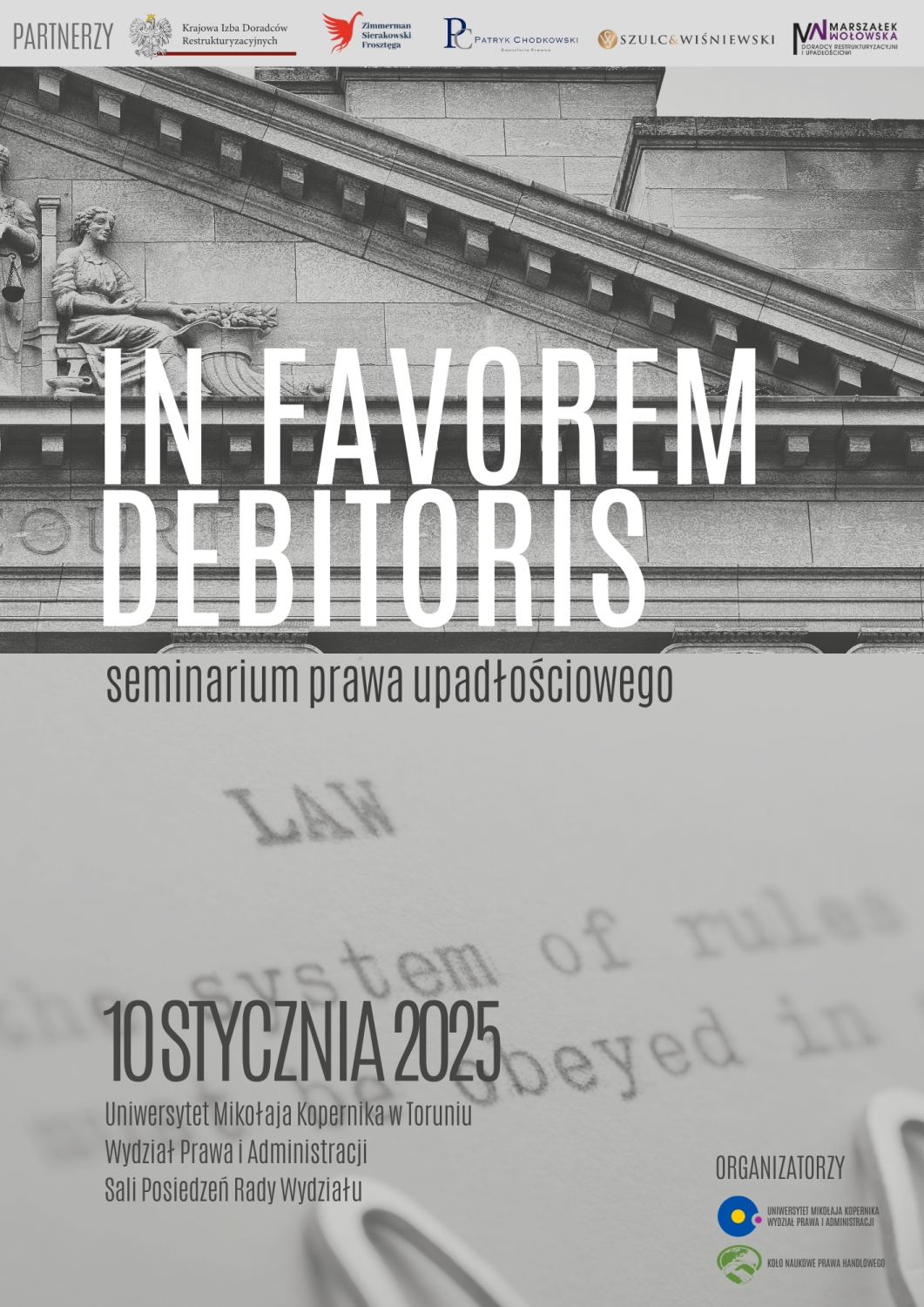 Naszymi gośćmi będą praktycy zajmujący się tą dziedziną prawa – doradcy restrukturyzacyjni oraz sędziowie Wydziału Gospodarczego Sądu Rejonowego w Toruniu. Seminarium poświęcone będzie praktycznym aspektom postępowań restrukturyzacyjnych oraz upadłościowych. Będzie ono okazją do poszerzenia wiedzy z tej dziedziny oraz poznania opinii fachowców zajmujących się sprawami upadłości przedsiębiorców oraz upadłości konsumentów. Patronatu seminarium udzieliła Krajowa Izba Doradców Restrukturyzacyjnych.