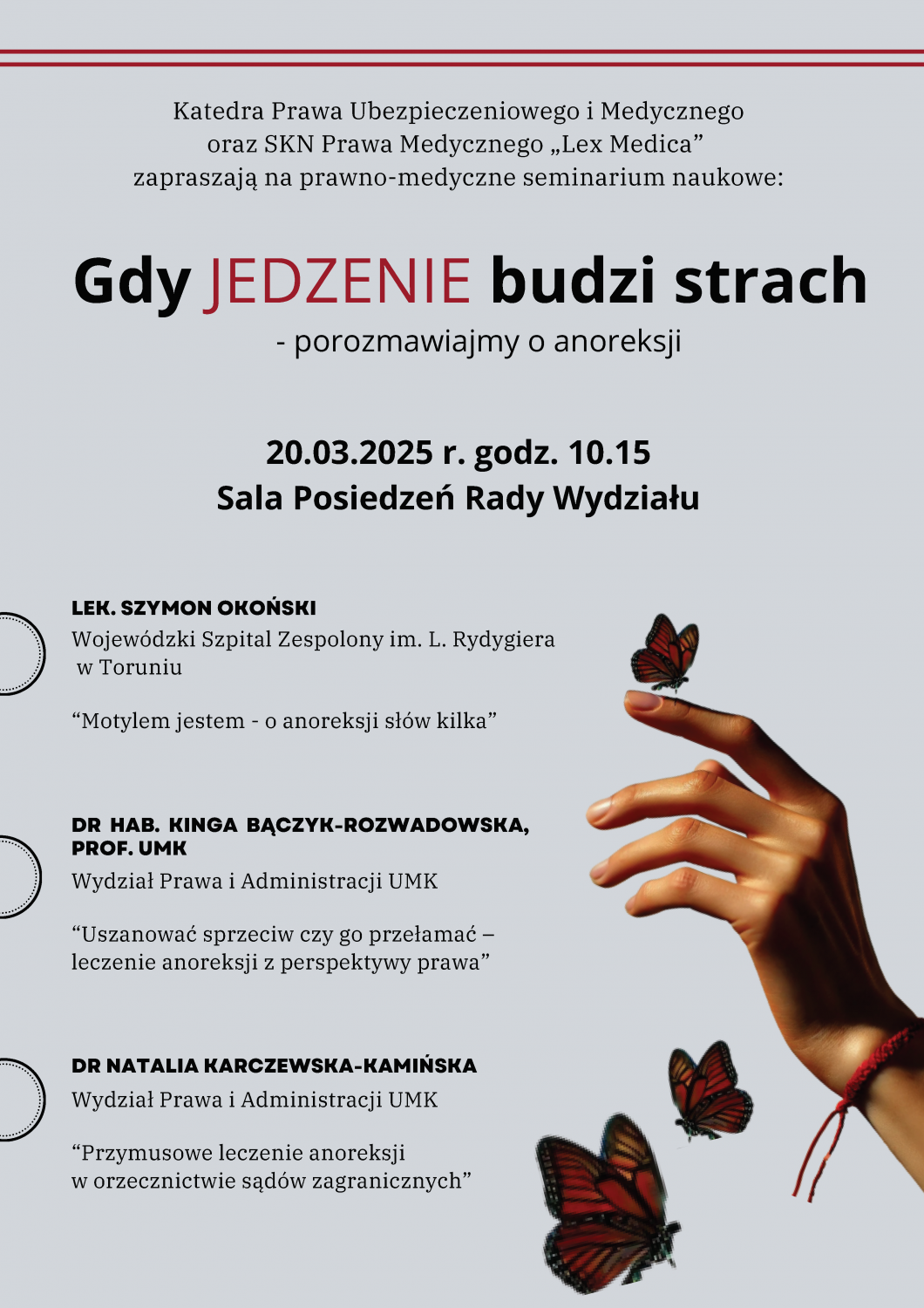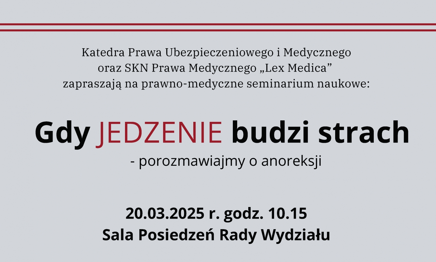 Katedra Prawa Ubezpieczeniowego i Medycznego oraz Studenckie Koło Naukowe Prawa Medycznego „Lex Medica” zapraszają na prawno-medyczne seminarium naukowe „Gdy jedzenie budzi strach – porozmawiajmy o anoreksji”.