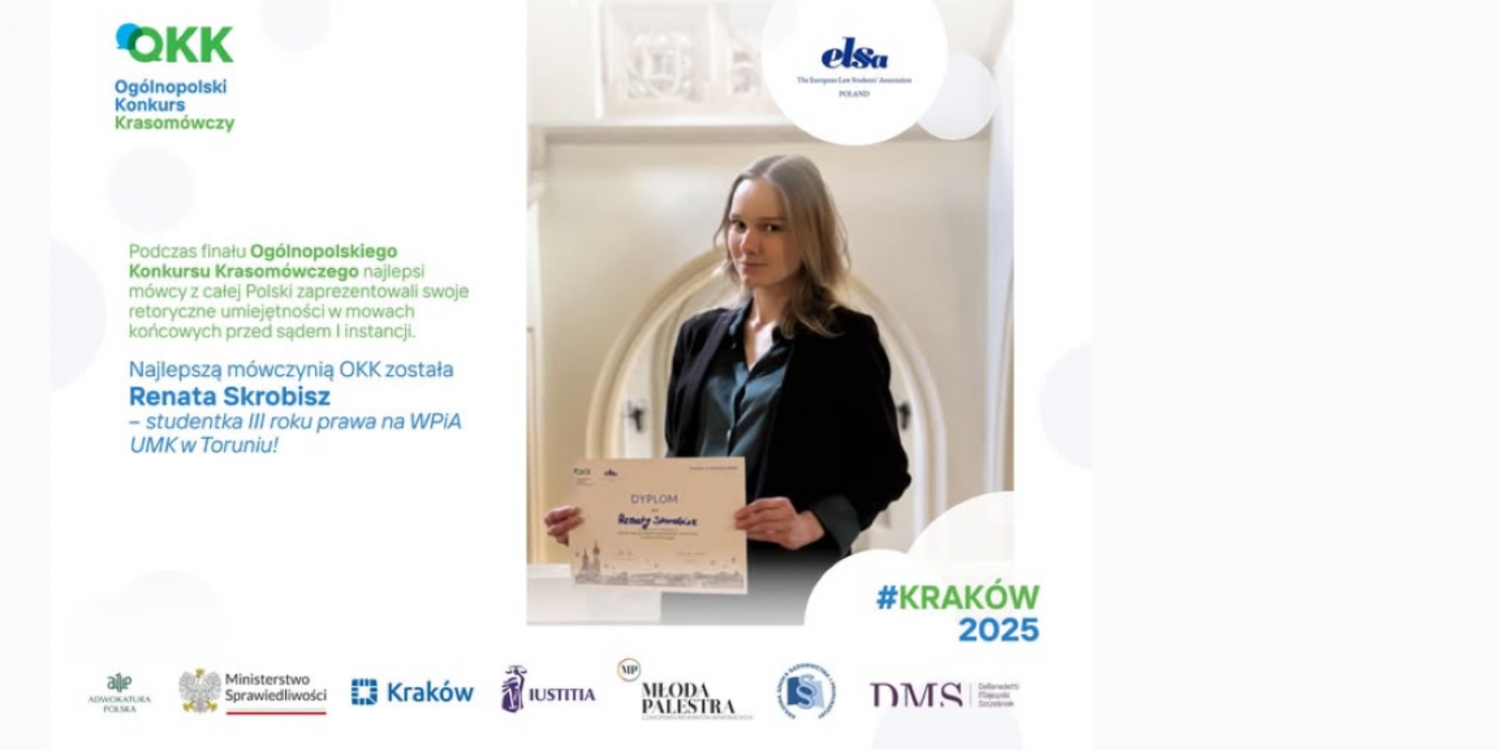 Renata Skrobisz – studentka III roku prawa WPiA UMK została zwyciężczynią Lokalnego Konkursu Krasomówczego w Toruniu a następnie laureatką pierwszego miejsca tegorocznego Ogólnopolskiego Konkursu Krasomówczego! Składamy ogromne gratulacje i życzymy dalszych sukcesów!