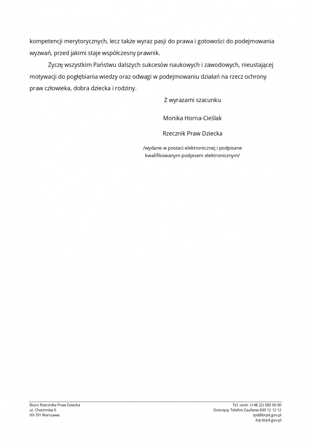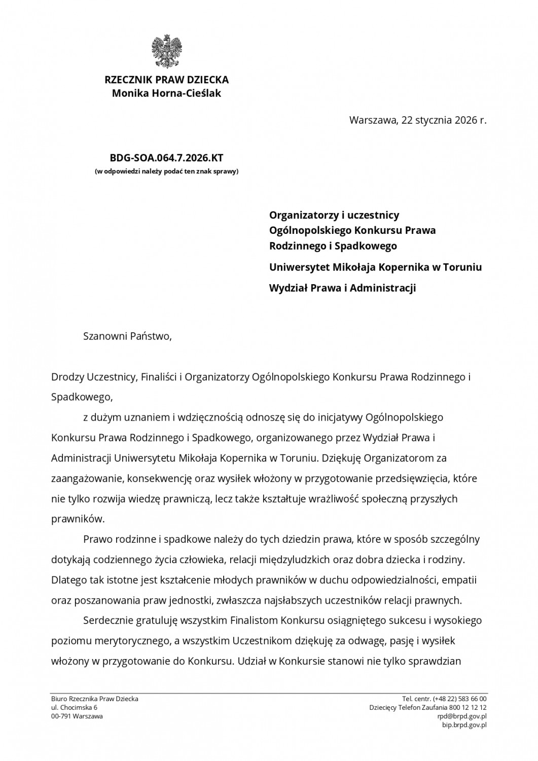 Specjalny list do uczestników oraz organizatorów Konkursu skierowali Rzecznik Praw Obywatelskich prof. Marcin Wiącek oraz Rzecznik Praw Dziecka p. Monika Horna-Cieślak (oba listy dostępne w galerii komunikatu).